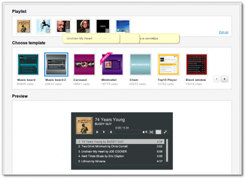 4. Последний этап заключается в публикации созданного аудиоплеера. Для этого вам выдается прямая ссылка, а также код для встраивания в веб-страницы или блоги. Кроме этого, вы можете разместить плеер в социальных сетях Facebook и Twitter, переслать по электронной почте.